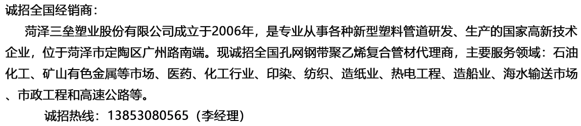 菏澤三壘塑業股份有限公司專業從事各種新型塑料管道研發和生產,重點研發了孔網鋼帶聚乙烯復合管材